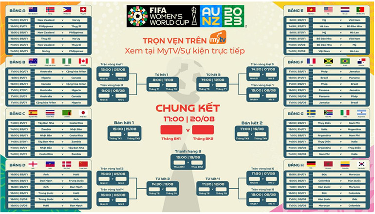 Khán giả đừng bỏ lỡ VCK FIFA World Cup Nữ 2023 từ ngày 20/7 đến ngày 20/8/2023, trực tiếp và trọn vẹn trên mục MyTV/Sự kiện trực tiếp của Truyền hình MyTV, với các nền tảng: SmartTV, SmartBox, Smartphone/Tablet (https://mytv.com.vn/tai-ve) và Web app https://mytv.com.vn.