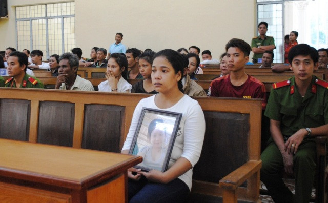 Mẹ cháu K. (áo trắng) mang di ảnh con gái tham dự phiên tòa sơ thẩm.