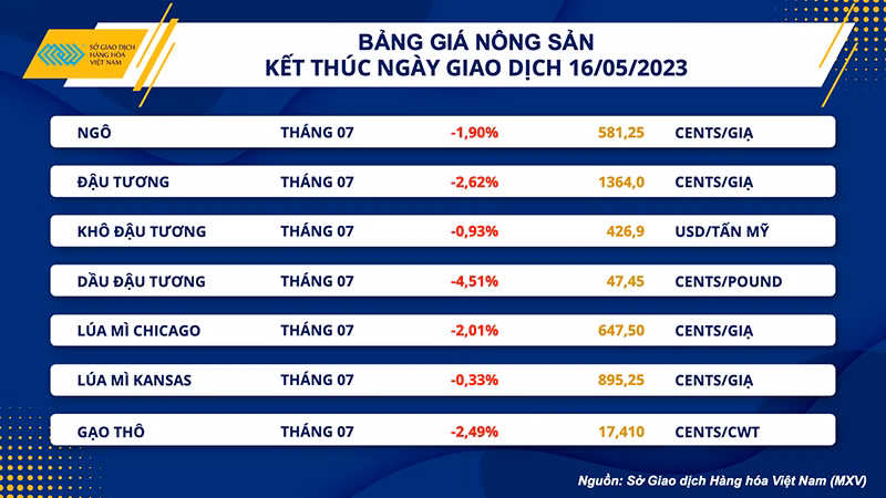 Toàn bộ các mặt hàng nông sản đóng cửa hôm qua (16/5) trong sắc đỏ. Dầu đậu tương giảm mạnh 4,5% xuống 1.046 USD/tấn, nối dài đà giảm sang phiên thứ 7 liên tiếp. Trong khi đó, khô đậu tương cũng kết thúc chuỗi tăng 4 phiên, giảm gần 1%.