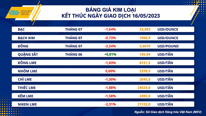 Trong tổng số 10 mặt hàng kim loại đang được giao dịch liên thông với các Sở Giao dịch thế giới, có tới 8 mặt hàng giảm giá. Giá bạc giảm 1,64% về 23,89 USD/ounce, mức thấp nhất kể từ ngày 4/4. Bạch kim có mức giảm thấp nhất nhóm khi giảm 0,73% xuống 1.066,9 USD/ounce.