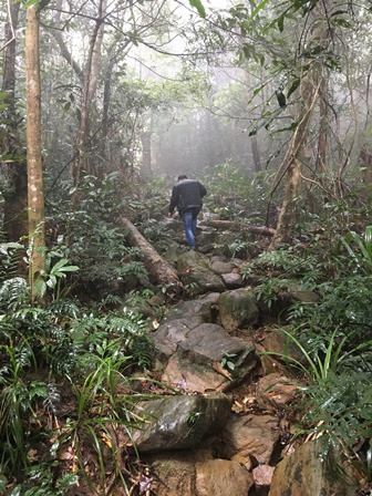 Khoác trên vai một ba-lô đầy lương thực, thực phẩm, trung úy Tuấn Anh vừa bước đi thoăn thoắt vừa tranh thủ giới thiệu hành trình vượt núi sắp tới. Khi đồng chí vừa dứt lời, đoạn đường đất rộng bằng phẳng cũng kết thúc. Hành trình đến với những “mắt thần” canh biển thật sự xuất hiện, câu chuyện rôm rả của các phóng viên thưa dần. Đường lên trạm chủ yếu là các rãnh tự nhiên, càng lên cao, đường càng dốc. Có đoạn rêu phủ dày đặc, những phiến đá sắc nhọn nhô lên lởm chởm, chúng tôi vừa đi vừa thận trọng mò mẫm vì sợ trượt ngã. Có đoạn dốc thẳng đứng, chúng tôi phải tận dụng những hòn đá to hoặc rễ cây nổi trên mặt đất để bước qua. Mưa mỗi lúc lại thêm nặng hạt, nước từ kẽ lá rớt xuống ướt đẫm mũ và áo khoác. Mồ hôi tuôn đầm đìa, cơ thể của chúng tôi dường như không còn cảm nhận được cái rét mướt của mùa đông nữa.