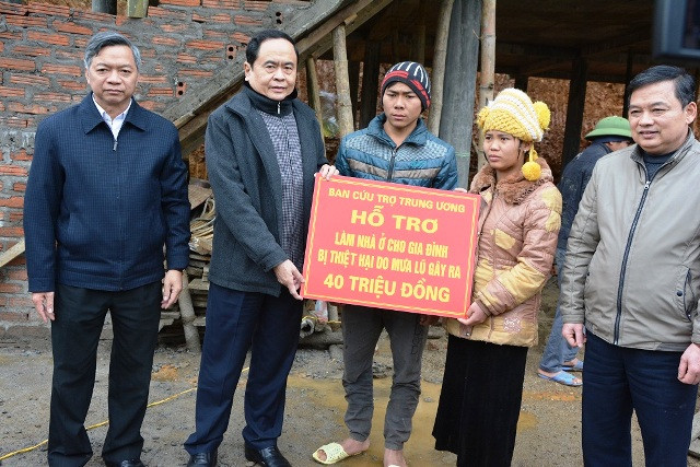 Lãnh đạo MTTQ Việt Nam trao hỗ trợ cho đồng bào xã Hát Lừu, Trạm Tấu. (Ảnh: THANH SƠN)