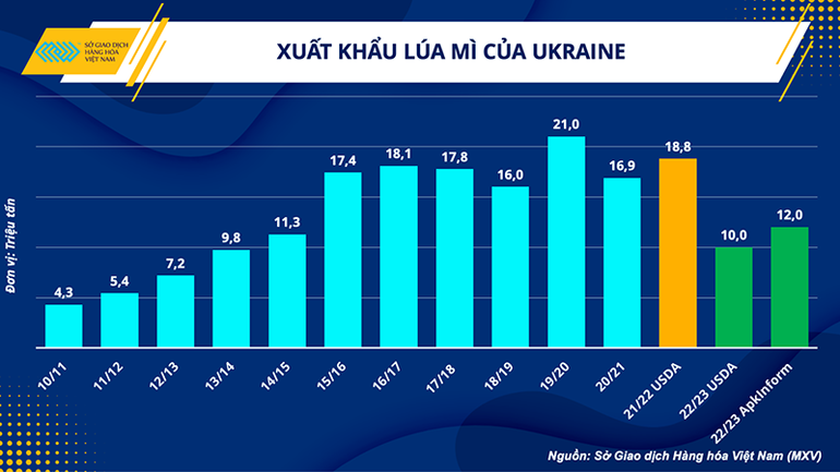 Ở thời điểm hiện tại, sự tắc nghẽn tại các cảng ở Biển Đen đã khiến lương thực của Ukraine phải xuất khẩu qua các nước trong khu vực châu Âu. Theo số liệu thống kê của Apk-Inform, xuất khẩu ngũ cốc trong tháng 6 của quốc gia này đạt 1,4 triệu tấn, tăng hơn 20% so số liệu tháng 5. Không chỉ vậy, trong niên vụ 21/22 kết thúc ngày 30/6, Ukraine đã xuất khẩu 18,7 triệu tấn lúa mì, tăng 13% so niên vụ trước. Hãng tin này cũng dự báo con số này có thể vượt lên mức 10 triệu tấn mà Bộ Nông nghiệp Mỹ (USDA) dự báo trong niên vụ 22/23.