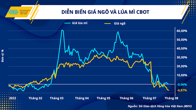 Trước hàng loạt thông tin khả quan về triển vọng nối lại hoạt động lưu thông nông sản trên Biển Đen, câu chuyện về việc lao dốc của giá nông sản cũng là điều dễ hiểu. Sau khi đạt mức đỉnh lịch sử vào tháng 5, giá ngô và lúa mì đã chứng kiến một cú trượt dài về vùng giá trước khi căng thẳng chính trị nổ ra. Theo Sở Giao dịch hàng hóa Việt Nam (MXV), kết thúc phiên giao dịch ngày 21/7, giá lúa mì Chicago đã sụt giảm hơn 1% xuống mức 806 cent/giạ (~ 296 USD/tấn). Tương tự với lúa mì, đà giảm mạnh của giá ngô cũng tiếp tục được kéo dài và đóng cửa phiên hôm qua với mức giảm 2,8%.