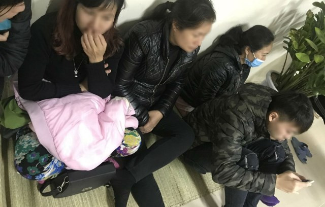Người nhà bệnh nhân trải chiếu xuống đất ngồi chờ.