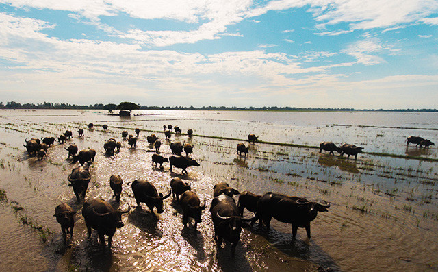 Thời điểm này, miền Tây rất đẹp. Bởi mùa nước nổi tràn đồng, trắng xóa con nước bạc. Đồng bằng sông Cửu Long có hai “túi nước” tự nhiên khổng lồ là vùng Tứ giác Long Xuyên và Đồng Tháp Mười, với khả năng tích trữ hơn 9 tỷ m3 nước trong mùa nước nổi mỗi vùng. Tứ giác Long Xuyên bao gồm các tỉnh An Giang, Kiên Giang và TP Cần Thơ. Còn Đồng Tháp Mười gồm các tỉnh Đồng Tháp, Tiền Giang và Long An. Hiện nay, việc phát triển đê bao trồng lúa mỗi năm ba vụ khiến khả năng trữ nước của hai “túi nước” này đã giảm gần 50%. Nếu không thông thạo địa hình miền Tây Nam Bộ sẽ khó tìm thấy mùa nước nổi. Nếu chạy theo trục lộ chính xuyên qua các tỉnh này, gần như chỉ thấy lúa và lúa, còn nước rất hiếm hoi. Nhưng có một cung đường “phượt” đi vào vùng “rốn” của mùa nước nổi, đó là đi dọc biên giới tây nam.