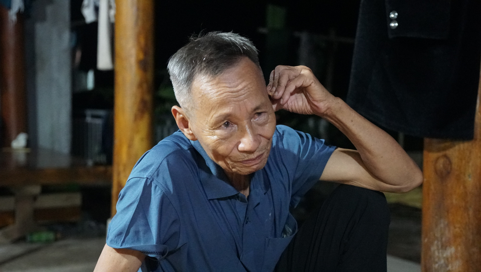 “Sức của con người mình, thiên nhiên làm cho mình cũng phải chịu thôi. Không biết làm thế nào cả. Bây giờ khóc, nước mắt không giải quyết được vấn đề gì cả, chị ạ. Nhà mới thoát nghèo được 3 tháng, nhìn cũng xót lắm nhưng cứ nhắm mắt lấy buồn làm vui thôi” - ông Thanh chỉ vào một khoảng đen - nơi từng có ánh điện sáng trong sân nhà ông.